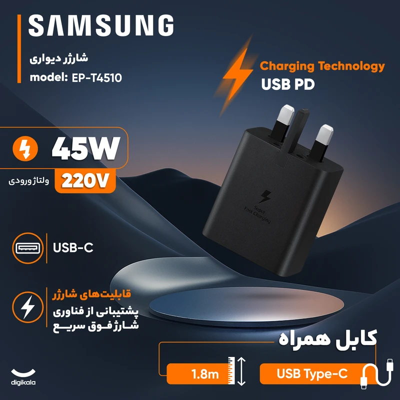 شارژر سامسونگ 45 وات سه پین با کابل اصل