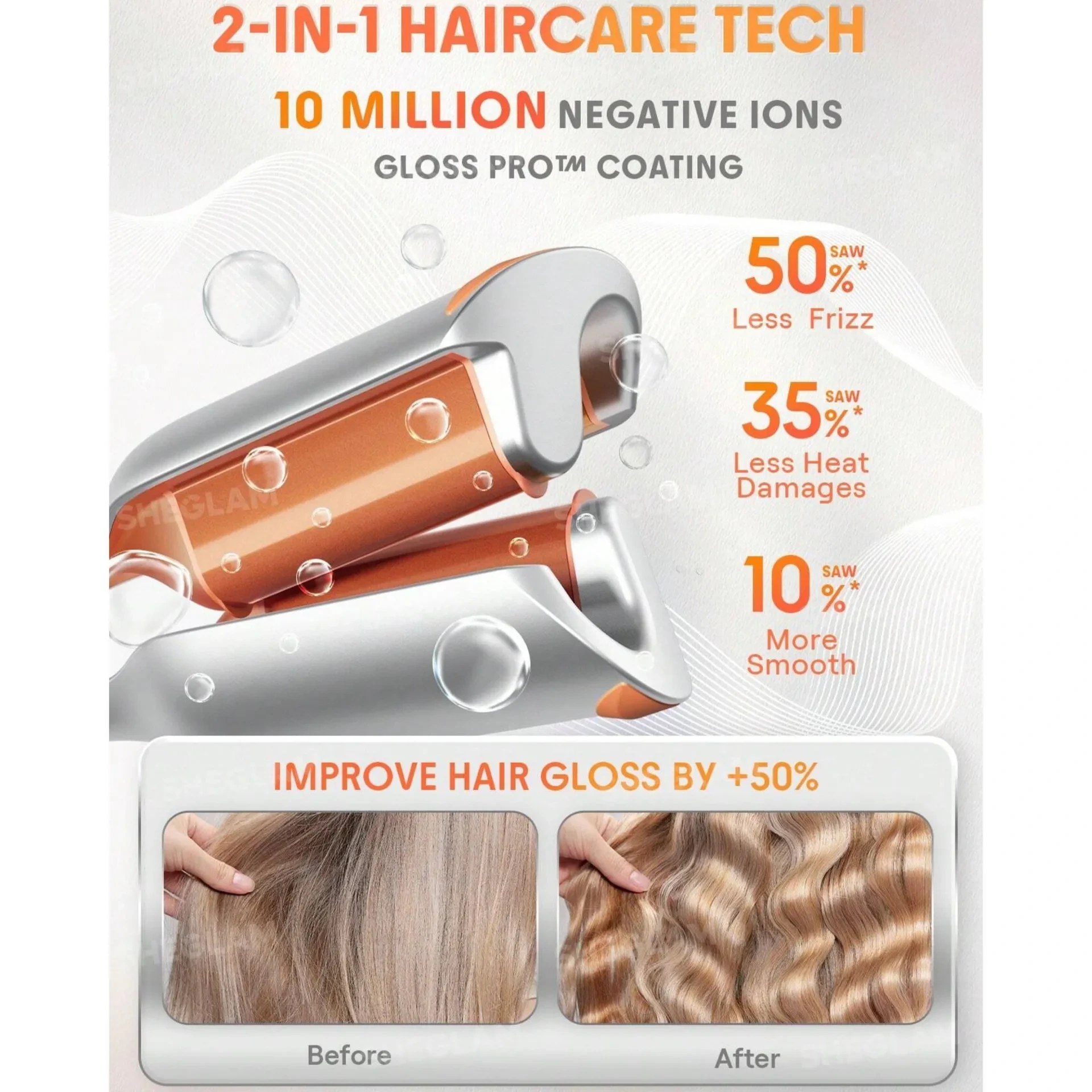 -مناسب موهای متوسط و بلند(برای موهای کوتاه نتیجه مطلوبی ندارد)-ولتاژ ورودی حدود ۱۱۰تا۲۴۰ولت-۵حالت تنظیم دما دارد-تایمر ۷ثانیه ای برای هشدار حالت اتمام موج زنی دارد-دارای پوشش سرامیکی با فناوری gloss pro برای کاهش اسیب به مو وصافی و جلا بیشتر به مو-دستگاه دارای ۵۰میلیون یون منفی برای کاهش وزی مو والکتریسیته ساکن